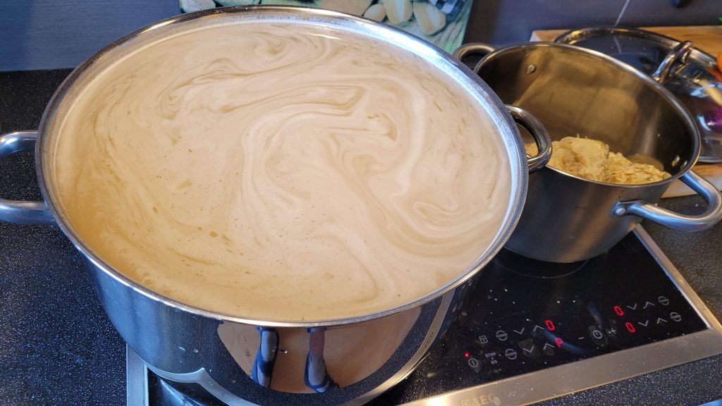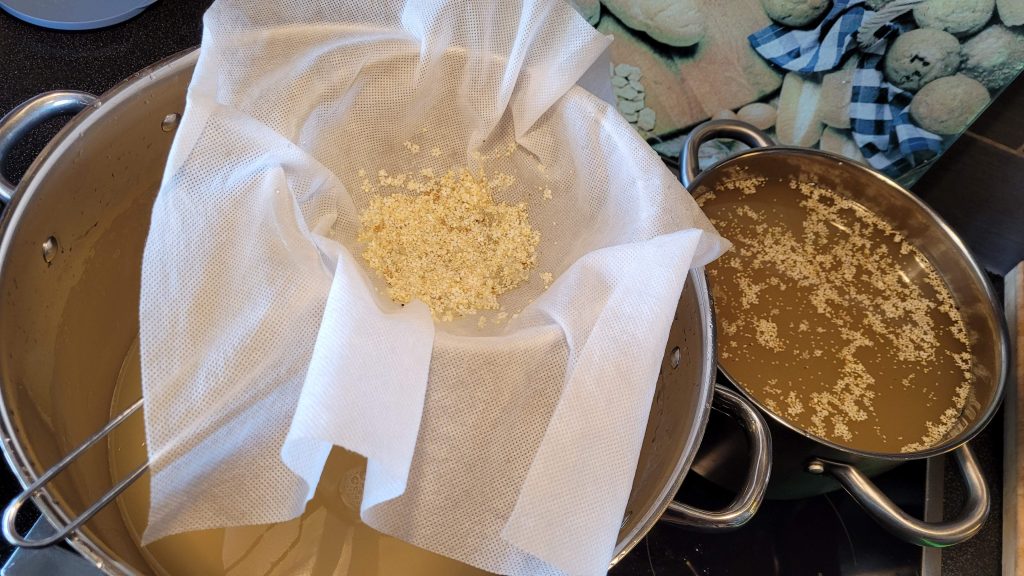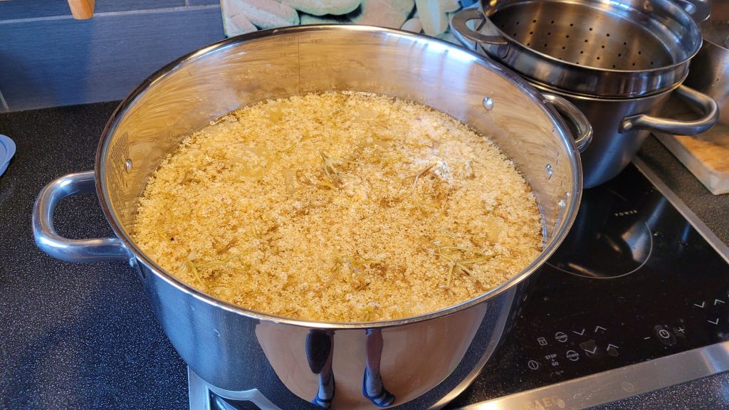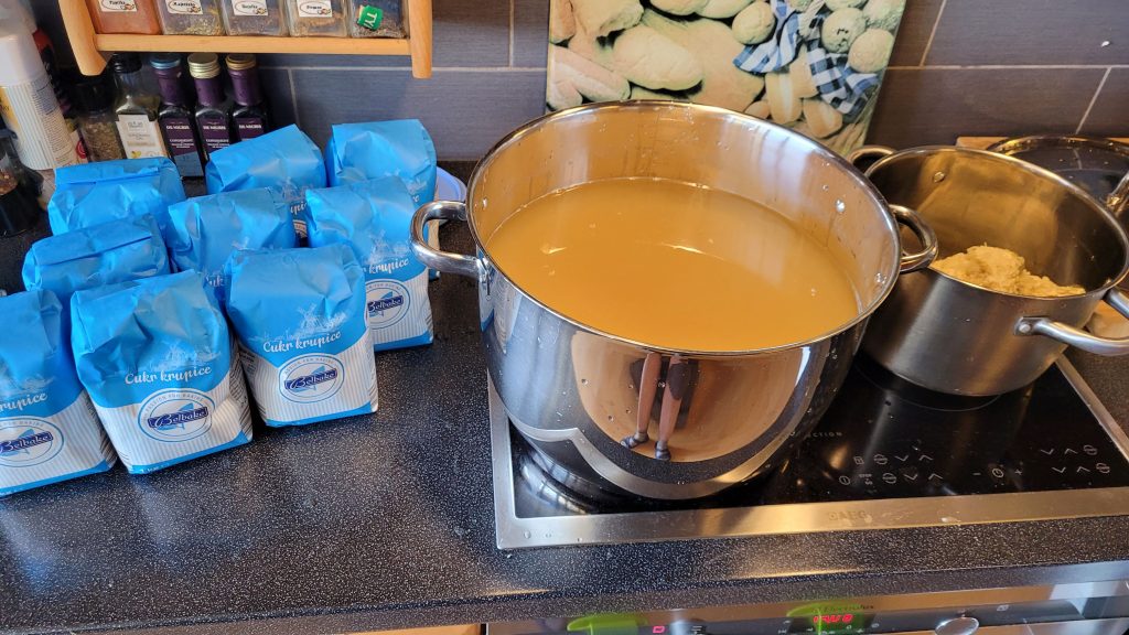 Na přiložených fotkách je výroba 3 dávek sirupu. Z 9 litrů vody na začátku vychází cca 8,5 litru macerátu. Do toho rozpouštím 8,5 kg cukru a vychází z toho 14 litrů výsledného sirupu.