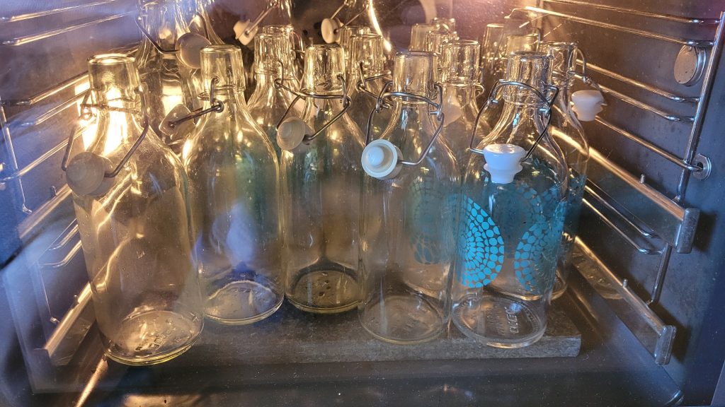 Mezitím si vysterilizujeme sklenice/lahve. Nechávám je v troubě na 80 stupňů cca 45 minut.