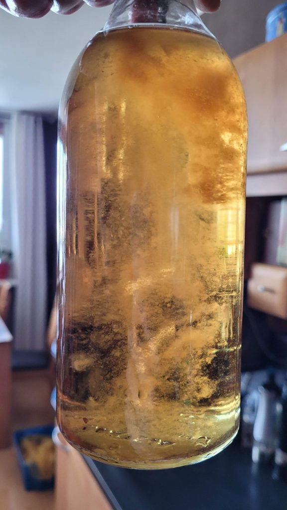 V sirupu se časem vytváří sraženiny viz poslední foto. Jde o vysrážený pyl a další látky z květů. Není to nic závadného, stačí sirup protřepat.